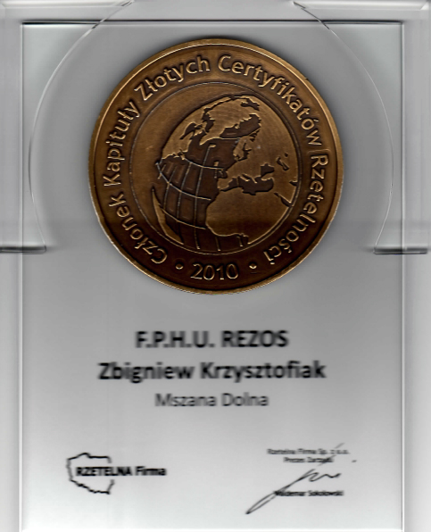 Wiarygodność Firmy Rezos została wielokrotnie potwierdzona przyznanymi certyfikatami między innymi Członek Kapituły Rzetelnych Firm 2010r., 2011r.,Dynamiczna Firma 2011r., Złoty Certyfikat Rzetelności 2010r., 2011r., 2012r., Gazela Biznesu 2012 r., Solidna Firma 2015r., Solidna Firma 2016r.